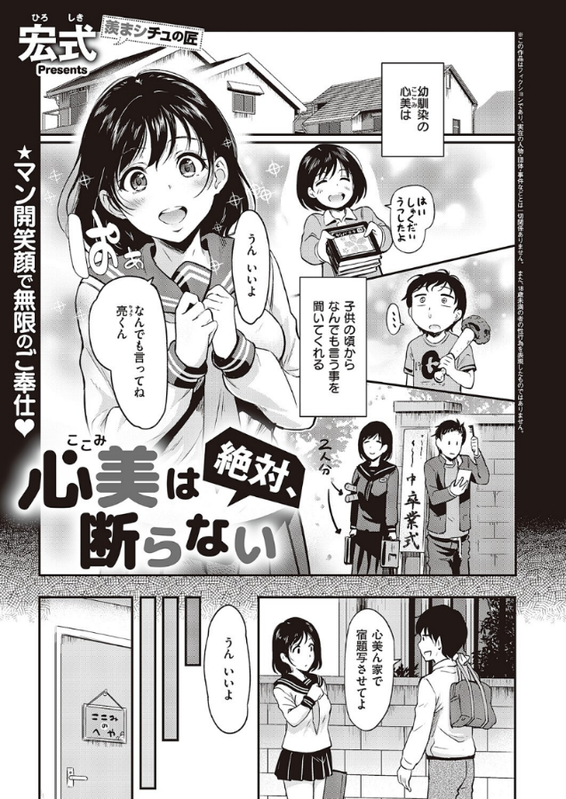 さらに、お尻を触っても、パンツを見せてと言っても断らない心美に、俺は「アソコを見せて」とマ○コを見ようとすると「好きにして!!」と無防備に股間をさらして…♪羨まシチュの匠・宏式先生が贈る、断れない系巨乳幼馴染にエッチなお願いはどこまでイケるか検証してみた☆