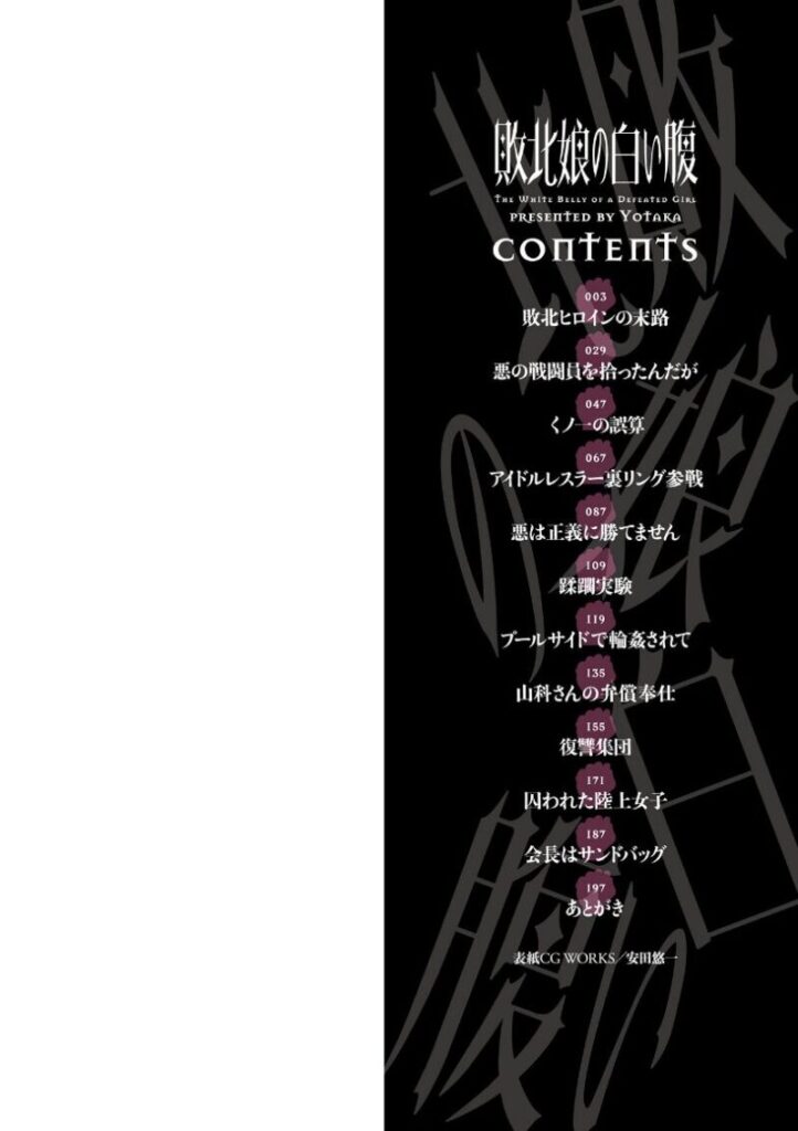 『もうお腹は殴らないでください…!』罪なき少女の白い腹に強烈なパンチを叩き込み集団でよってたかって凌●する悪逆非道の行い…。腹パンの苦痛とレ●プの屈辱に歪む可愛い顔と汚濁精液に塗れたエロ肢体を活写した著者初単行本!《収録作品紹介》悪の組織の戦闘員を追い詰めた魔法少女ルミ。しかし、罠にハメられたルミは敵に囲まれてしまい強烈な腹パンを喰らう。抵抗力を失ったルミは衣服を脱がされ、その豊満な乳房をまろび出されてしまい…。(敗北ヒロインの末路)街を破壊する悪の組織・ブラックの下級女戦闘員が廃墟で気絶していたところを発見した民間人の男。そのまま連れ去って自宅地下室に拘束し、女戦闘員に性の知識が一切無いことをいいことにその豊満なカラダを弄び始めて…。(悪の戦闘員を拾ったんだが)非道な領主を討つために村人に雇われたくノ一。しかし捕まってしまい、腹にパンチを受けるなど残酷な拷問を受けていた。しびれ薬のせいで身体の自由を封じられたくノ一は全裸に剥かれ、容赦なく喉奥を突かれるイラマチオをされて…。(くノ一の誤算)【収録作品】・敗北ヒロインの末路・悪の戦闘員を拾ったんだが・くノ一の誤算・アイドルレスラー裏リング参戦・悪は正義に勝てません・蹂躙実験・プールサイドで輪●されて・山科さんの弁償奉仕・復讐集団・囚われた陸上女子・会長はサンドバッグ全11作品収録