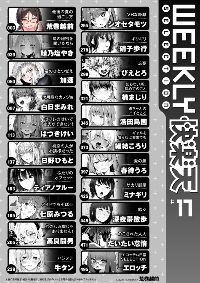- 作者 : 荒巻越前 鯖乃塩やき 加速 白日まみれ ミナギリ エロッチ 牛タン 七原みつる 硝子歩行 緒結ころり 春待うろ ティアノブルー 高良間男 シオセタモツ 浩田島国 楠まじり はづきけい 深夜帯散歩 だいたい怠惰 ぴえとろ 日野ひもと